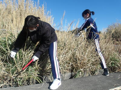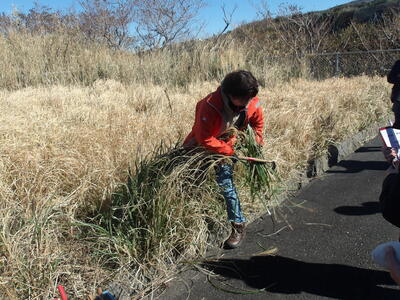 まずは、学校近くの多くの茅葺が生えている場所に移動し、茅葺を刈りました。