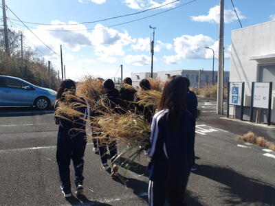 刈り取った茅葺を持って、学校の中庭に移動しました。