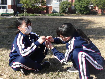 次に刈り取った茅葺を編み込んで縄を作り、茅葺を束にまとめていく工程に移りました。