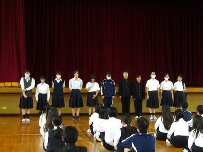 今日は、環境美化委員会の活動を報告します。環境美化委員会の一つ目の取組は、掃除の仕方を動画にして、給食時に視聴してもらう活動、二つ目は今日の朝行った美化活動です。環境美化委員は村営バスの1便を利用していつもより早く登校し、学校周辺の掃き掃除を行いました。朝早く起きるのはつらかったと思いますが、清掃後は、道路もきれいになりスクールバスで登校してきた生徒も気持ちよく一日が始まったと思います。環境美化委員のみなさんありがとうございました。