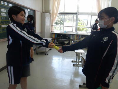 生徒会では、挨拶強化運動を実施しています。学年ごとに授業の初めと終わりの挨拶のチェック。そして学校全体の取組として、挨拶バトンリレーを行っています。挨拶バトンリレーとは、毎日9人(各学年3個)にお題が書いてあるバトンを配って、そのバトンをもらった人は、バトンに書かれているお題(他学年に渡す、違う部活の人に渡すなど)にあてはまる人に挨拶して渡すという取組です。この取組を通して挨拶であふれる三宅中を目指しています。