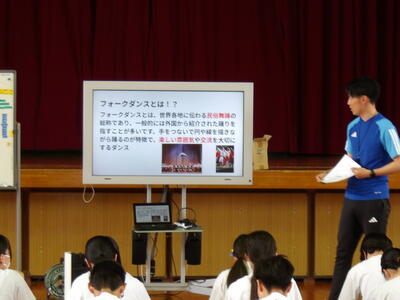 今日の授業は「日本と海外のフォークダンスの特徴をとらえる」でした。日本の伝統的な民踊として「ソーラン節」「花笠音頭」「阿波おどり」「あじさい音頭」、海外のフォークダンスとして「オクラホマ・ミクサー」「マイム・マイム」「ドードレブスカ・ポルカ」「ジェンガ」を学習しました。実際にあじさい音頭とオクラホマ・ミクサー、ジェンガを体験して、日本と海外の違いについて考え発表しました。日本は「作業唄が多い」海外は「男女ペアやグループがある」など特徴について理解を深めていました。