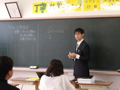 今日の授業の目標は「いろいろな累乗の表し方を理解し計算できるようにする」でした。初めに乗法の計算確認プリントに取り組みました。生徒は10問を5分以内に解くことができました。今日の内容に入る前に、4月17日に行った指数についての授業内容をノートで確認しました。その後、負の数や分数を累乗の表し方を生徒と共に学習を進めました。生徒は先生の説明にうなずきながらノートに書いていました。最後に累乗の計算にもチャレンジして授業は終了しました。