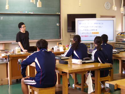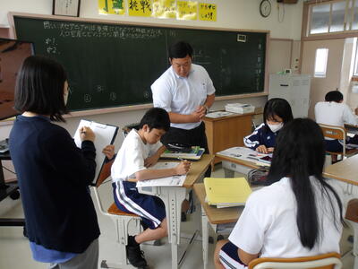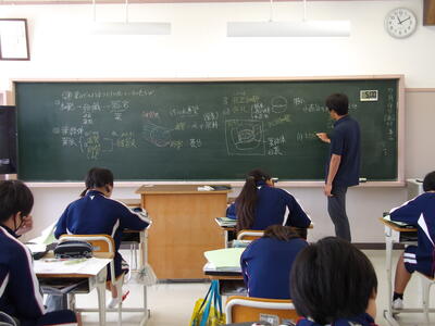 今日の研究授業は、社会科の地理分野「オセアニア州」を学習しました。オセアニア州は、気候にどのような特徴がみられ、人口密度とどのような関連があるのかを、生徒が主体的に学習に取り組めるようなワークシートを用いて授業を進めました。資料の読み取りをグループで行った後、グループ内で共有しました。そして、どのように考えたのかを発表しました。授業の最後には、今日学習した内容を振り返りシートに記入しました。振り返りシートには「乾燥帯は人口密度が低く、温帯は人口密度が高い」と書いている生徒や地図を乾燥帯と温帯で色分けしている生徒など、後で見直すことができる振り返りシートを仕上げていました。