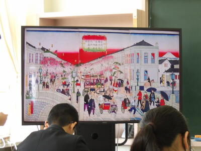 今日の問いは「富国強兵・文明開化は人々の生活にどのような影響をあたえたのだろうか」でした。まず初めに、当時の様子が描かれた木版画をみて、開国後の日本に入ってきたものや習慣を探してプリントに記入しました。最初は個人で探してその後グループで書いた内容を共有しました。時間がある班はさらに他にないかグループで探しました。出てきたものとして、「レンガ造りの建物」「ガス灯」「靴」「シャンデリア」「車道と歩道」などたくさん見つけることができました。近代社会になり何が変わったのかを学習しました。