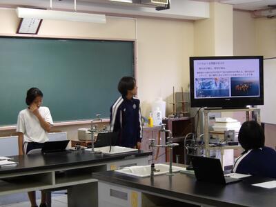 写真を使って発表する、アニメーションを使って発表する、クイズを出題して発表するなど各班工夫を凝らして発表していました。発表の中での改善策として「歩ける距離は歩く」「自動車ではなく自転車に乗る」「油やくずを水に流さない」「外来生物を捨てない」など発表していました。発表後は、中学校3年間の生物分野最後のレポートを書きました。レポートでは自分たちに「何ができるか。どのような取組ができるか」についてまとめました。