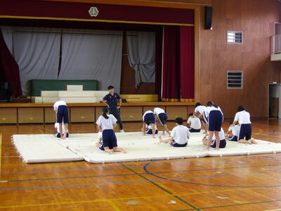 今日の授業はパフォーマンスマットでした。男女グループに分かれて、マットの上でおおよそ2分の曲に合わせてマット運動を取り入れた表現活動を行い、物語を表現します。授業は5分交代で男女のグループが動きの確認をしました。マットの上での演技は、動画撮影を行い、何度も確認しながら修正していきました。5分経つと交代の時間となりモニターの前に集まり映像を見ながら動きや内容の確認をしました。この10分のセットを3回繰り返し、表現の質を高める授業でした。授業の最後に「明日の授業が発表の時間です」と先生から話がありました。本番の表現が楽しみです。