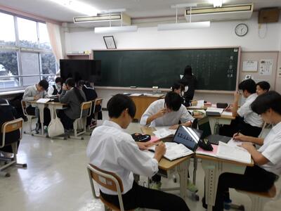 今日の授業は、漢文の読み方「訓読の仕方の確認」を学習しました。漢字だけで書かれた中国語の文章を白文、返り点を付けたものを訓読文、訓読文を日本語の文章として書き改めたものを書き下し文と先生から話がありました。そして、プリントに書かれた数字を順番どおりに読めるように返り点を考えました。個人考えて、その後グループで問題に取り組みました。生徒は「なぜ暗号みたいな返り点をつけるのか」など疑問を口にしながら、とても意欲的に取り組んでいました。今日はウォーミングアップに時間がかかり、プリント途中で終わってしまいましたが、次回までにきちんと訓読の仕方を復習しておきましょう。