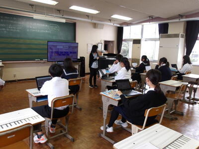 今日の授業は、「詩と音楽の関りを味わって聴こう」です。まず初めにクイズ形式のアプリを使って期末テスト対策問題全10問に取り組みました。制限時間内に4択から答えを選択していくアプリです。難しい問題もあり「わからない」と言いながらも一所懸命に取り組んでいました。