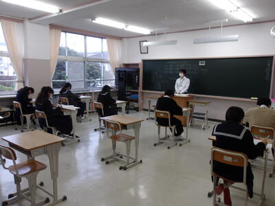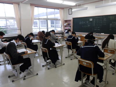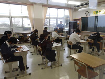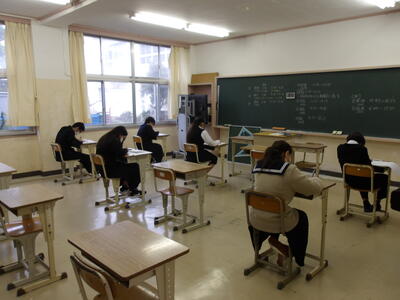 11月17日(月)から3日間予定していた期末考査ですが、インフルエンザ感染拡大防止のため、急きょ18日(火)から3日間臨時休校としました。学校再開後、21日(金)に期末考査2日目、連休明けの25日(火)に期末考査3日目(最終日)を行いました。生徒にとっては、期末考査の日程が変更になり、テスト勉強も含めて調整が大変だったと思います。3日目の今日は各教室と少人数教室に分かれてテストを受けましたが、テスト時間終了時刻まで頑張って取り組んでいる生徒の姿が見られました。