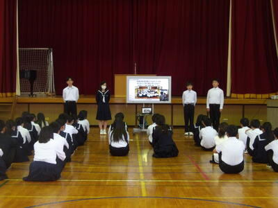 今日の学校朝礼では、生徒会役員から八丈島と青ヶ島の中学校へ向けて取り組んできた応援メッセージと募金活動の報告がありました。これは、10月に発生した台風22号、23号が八丈島と青ヶ島に直撃し甚大な被害が発生していることをニュースで知り、みんなで何かできないかと生徒会が企画した取組です。募金活動では保護者の皆様にもご協力いただきありがとうございました。集まった募金は、11/27に生徒会が村役場へ行き村長に手渡す予定です。