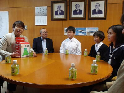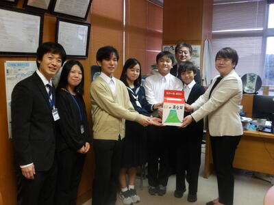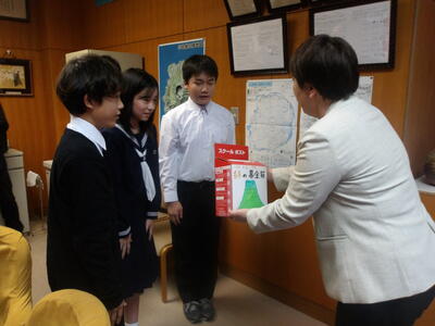 本日三宅村役場に行き、生徒会本部役員4名が中学校の代表として訪問し、村長へ直接手渡しました。「中学生の清らかな心に触れるといつも元気をもらうことができます」と村長からは温かいメッセージもいただきました。