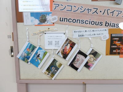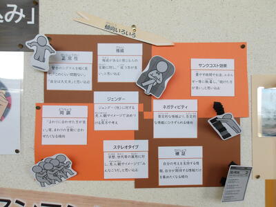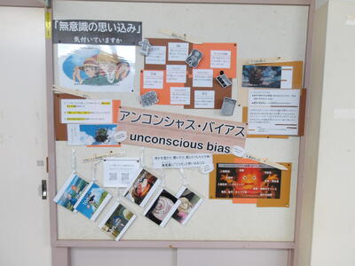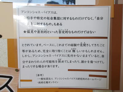 保健室前の掲示板は、本校養護教諭が「今生徒に伝えたいこと」を定期的に更新してくれています。今回は、「アンコンシャス・バイアス」です。日本語では「無意識の思い込み」等とも表現されている概念です。決めつけの考えや言葉が出たときや誰かや何かと比べて決めようとしたときなどに気付いてほしいという思いが込められています。ぜひ、足を止めてみ見てもらいたいと思っています。保護者の皆様もご来校の際にはぜひご覧ください。