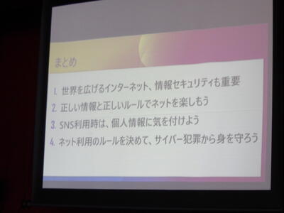 今日の6時間目にNTT東日本の職員の皆様にお越しいただき、セーフティ教室を行いました。講話ではインターネットでしてはいけないことやインターネットのコミュニケーションマナー、サイバー犯罪・ネット依存について実際の話を交えながら教えてもらいました。