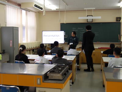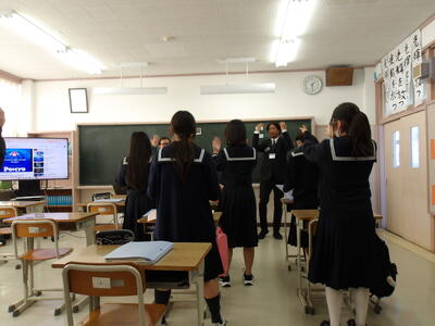 最初のWarming-upでは英語の歌を振り付けしながら歌いました。そしてALTが実際に英語落語を披露しました。今日の授業はLesson8の扉絵から英語落語について考えるでした。生徒はペンを1本使って英語でジェスチャーして相手に伝え合いました。次に、本文の内容の読み取り練習を行った後、最後のまとめでは現在完了形の肯定文と疑問文の特徴や決まりについて振り返りを行いました。次回は、今日学習した内容を使って「書く」授業です。