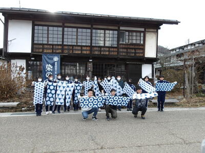 見本の絵柄から好きな柄を選び、手ぬぐいを染めていきました。三角形に折られた手ぬぐいを藍染の先生の指示に従って30秒間染めました。絵柄によって何度か染める工程を繰り返し、手ぬぐいを広げると万華鏡のようなきれいな模様に染まった手ぬぐいになりました。空気に触れるときれいな藍色になっていきました。その場で持ち帰ることができました。