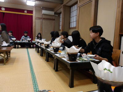 昼食後にそば打ち体験のそばを食べたため、あまりお腹が空いていませんでしたが、夕食は品数がとても多くクラスメイトと会話しながら楽しく食べていました。19:00から文化交流があったため、時間を延長することができず時間が少し足りませんでした。