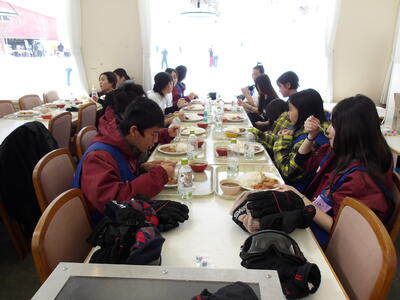 昼食は、カレーライスです。午前中は、硬いスキーブーツと長いスキー板を履いた状態での運動は、普段使わない筋肉を使い、初めての動きも多く、疲れている様子も見られましたが、普通盛りよりも多いカレーライスをほとんどの生徒が完食することができました。午後も練習が続きます。リフトに乗って上から滑るとスキーの楽しさを実感できるのですが、今は我慢の練習です。みんなファイト!