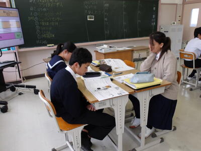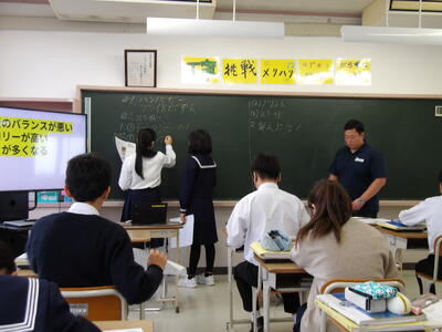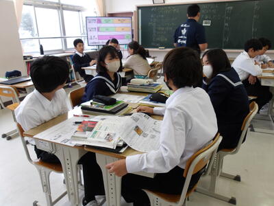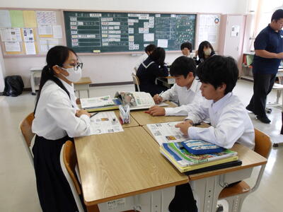 今日の授業の問いは「アメリカ合衆国の人々の生活には、どのような特色と課題があるのだろうか?」です。最初にテレビモニターに映し出された写真を見て「何が問題あると感じますか」と先生から問いを投げかけられました。ファーストフードのバーガーセットの写真を見て「紙を使っている」「茶色なのでバランスに偏りがある」など生徒から発言がありました。また、ゴミ収集の仕方が日本と違うことなど先生から動画をみながら説明がありました。後半のグループ活動の課題は、資料を読み取り持続可能な社会を実現するためにアメリカ合衆国の課題と解決策を考えました。
