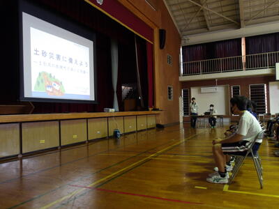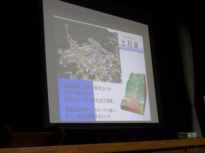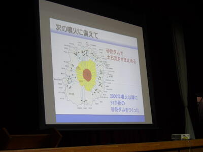今日は、三宅支庁土木港湾課の職員の皆様にお越しいただきました。初めにスライドを使って土砂災害について土石流の仕組みや三宅島の噴火の備えについて、そして土木港湾課の仕事について教えていただきました。