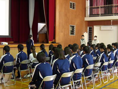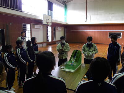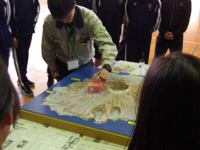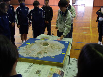 次に小型の土石流模型実験装置と三宅島を細部まで再現した模型を使った説明を聞きながら体験的に学ぶことができました。溶岩の流れを分かりやすく説明するために、シャンプーを立体模型に流して、どのように溶岩が流れていくのか見ることができました。今日の授業からは、土砂災害などの自然災害から島民の生活を守っていく仕事の大切さを学習することができました。三宅支庁土木港湾課の職員の皆様、年末のお忙しい中ありがとうございました。