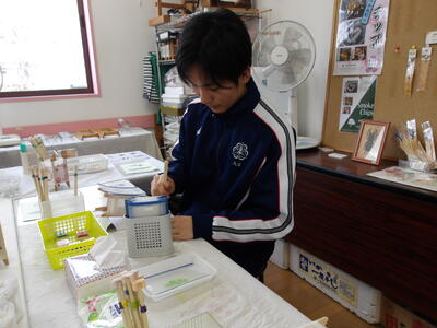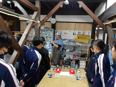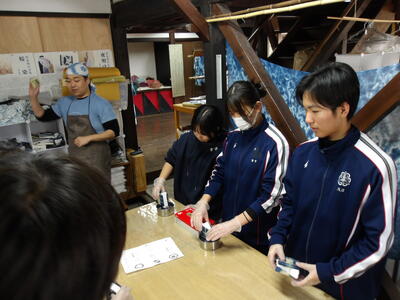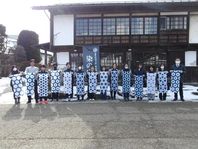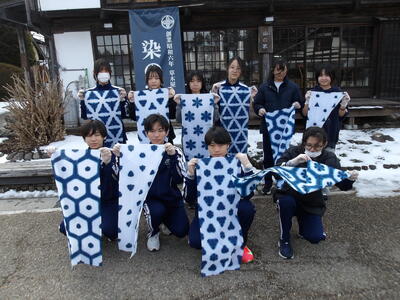 見本の絵柄から好きな柄を選び、手ぬぐいを染めていきました。三角形に折られた手ぬぐいを藍染の先生の指示に従って30秒間染めました。絵柄によって何度か染める工程を繰り返し、手ぬぐいを広げると万華鏡のようなきれいな模様に染まった手ぬぐいになりました。空気に触れるときれいな藍色に徐々に変化していくところもきれいに感じました。みんなで記念写真を撮り、作品は持ち帰ることができました。3日間は洗わず乾燥させてから洗うとよいそうです。