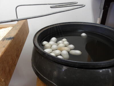 明治時代に使われていた座繰り機で煮出した繭から糸を挽き、巻いた糸車に飾り付けや絵付けをする体験です。(蚕・繭・絹の家工房ホームページより)