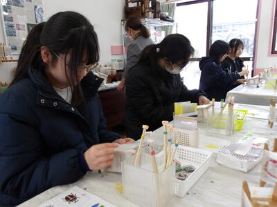 体験はステンシルタイプの色彩方法で制作していきました。準備された絵柄を選んで色付けをしました。絵付けが終わった後には、実際に座繰り機を回す体験もしました。おおよそ15個の繭から細い糸を取り出し束ねて1本の糸にして巻いていく様子を実際に見ることができました。