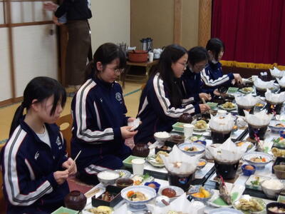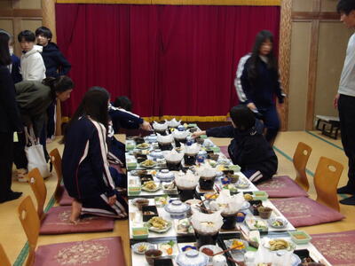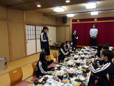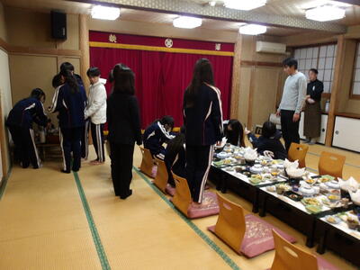 夕食はご飯やお水を配膳したり固形燃料にチャッカマンで火をつけたりとみんなで準備をしました。食事係の生徒がコップを持って乾杯ではなく「いただきます!」という笑顔になってしまう挨拶で食事が始まりました。みんなで会話しながら食べていましたが、品数がとても多かったため時間が足りなく全部食べきることができませんでした。明日は今日よりも夕食時間が少し長いのでいっぱい食べてほしいと願っています。