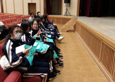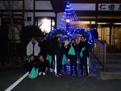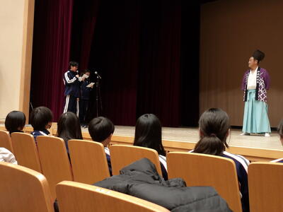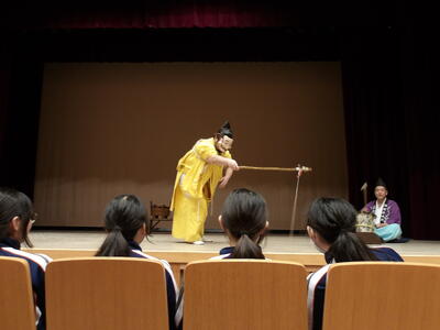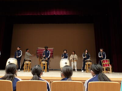 昼食で利用したまんてん星の湯の敷地内に三国館という多目的ホールがあり、そこでお神楽と三国太鼓を鑑賞しました。2000年の噴火で秋川高校での生活が始まったときから続いている文化交流で、旅館に飾られている歴代の三宅中学校2年生がお礼に書いた色紙にも、三国太鼓の写真が貼られていました。お神楽は群馬県の太々神楽で、恵比寿様が鯛を釣る非常に人気のあるおめでたい演目でした。三国太鼓はオリジナルの演奏と太鼓の体験をしました。文化交流から戻ってきて最後は仁田屋の前で写真を撮りました。体調は今日もみんな元気です。