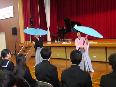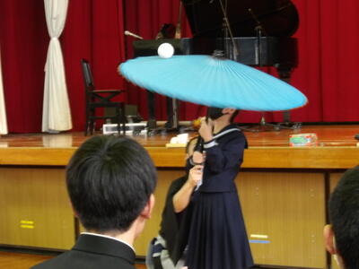 今日は、東京都教育委員会が令和5年度から都内の公立学校を対象に提供している体験活動の一つ「学びのスマイルフェスタ」を行いました。内容は太神楽やオペラ歌手とピアニストによる演奏、歌のおにいさんによる合唱指導と歌唱でした。太神楽では、縁起の良い代表的な曲芸の傘回しを見ることができ高い集中力と繊細なバランス感覚のすごさを感じました。オペラ歌手とピアニストによる演奏では、リトル・マーメイドの「Part of Your World」やレ・ミゼラブルの「民衆の歌」など体育館いっぱいに広がるピアノと歌声のハーモニーが響きました。歌のおにいさんには、「大切なもの」の歌い方について多くのアドバイスをもらうことができました。また、ぼよよん行進曲やありがとうの花も聞くことができ心に残る時間となりました。約1時間でしたが、生徒の表情がとても素敵だったことが印象的でした。今回ご協力いただいた関係者の皆さまありがとうございました。