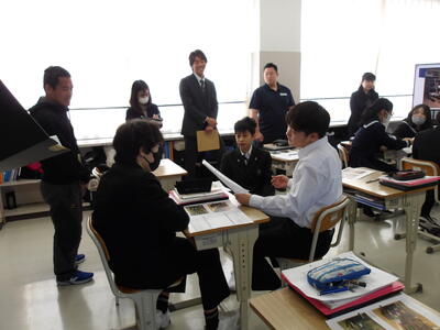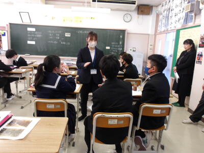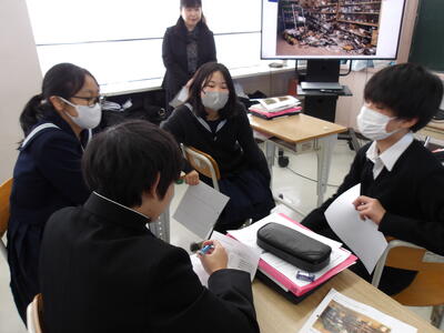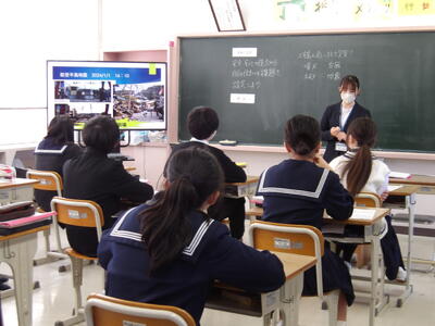 今日の目標は「安全・安心の視点から、自分の住まいの課題を設定しよう」でした。自然災害や家庭内での事故の防ぎ方など家族の安全を考えた住空間について考える全7時間の授業の1時間目でした。授業の始めには今まであった大きな地震の説明や三宅島の噴火など災害が起きたときの避難所開設についても話がありました。また、実際に震度6以上の地震が起こったときにどのような被害があるのか生成AIを活用した画像の説明もありました。