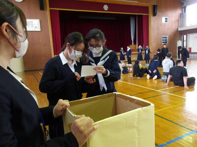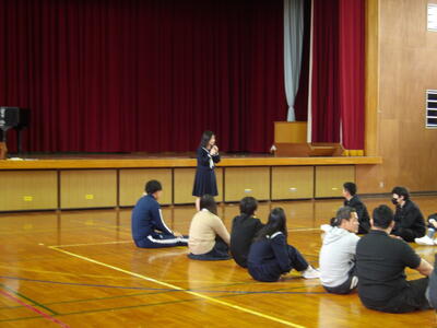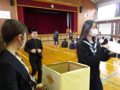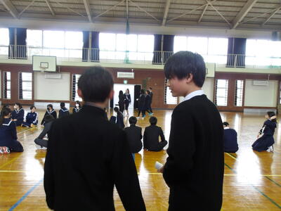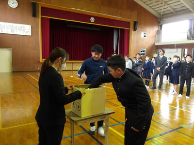 2月20日(金)全校昼レクWeek!最終日 投稿: 校長 (02/20) カテゴリー: 今日の出来事 今日は生徒会本部の取組「全校昼レクWeek!」の最終日でした。最終日の昼休みの取組は借人競争でした。この競技は、お題に書かれている内容に当てはまる人を見つけて審判の先生にジャッジしてもらい良ければ次の走者にバトンを渡す、チーム対抗戦です。お題には、「将来世界で活躍する人」や「将来村長になる人」など生徒会役員が考えた楽しいお題ばかりで短時間でしたが楽しい時間となりました。役員の皆さん企画・運営ありがとうございました。 Tweet -