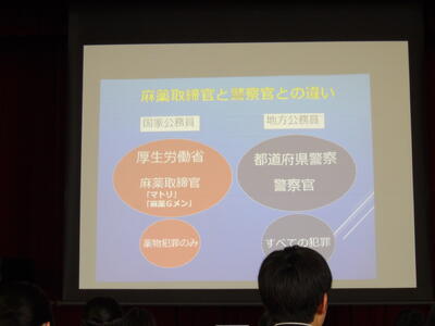 今日の5時間目は、薬物乱用防止教室を行いました。今回の講師は関東信越厚生局麻薬取締部横浜分室の指導官にお越しいただきました。講師の先生は、40年の経験から様々な話を通して、薬物の危険性について教えてくれました。「知らない人からもらったものは、絶対食べない」「きちんと学習して、怪しさを感じ取れるように」「パッケージを見てなんとなくあぶないなという感覚を身に付けて」など大切なことを教えてくれました。また、最後には「臆病だからこそいろいろな対処ができた」という先生自身の話もあり、臆病であることの大切さも学ぶことができました。講師の先生ありがとうございました。