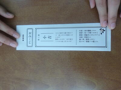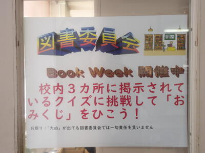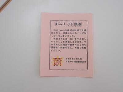 図書委員会では、多くの生徒が気軽に図書館を利用するきっかけとなるようBook Weekを企画しました。この取組は、校内に図書委員が作成した本に関するクイズを日替わりで掲示し、昼休みに図書館に行き、クイズの答えを図書委員に伝えるという内容です。回答した生徒の中で希望する生徒には、図書委員が作成した「おみくじ」をひいて楽しんでもらうという内容です。水曜日には予定していたおみくじがすべてなくなり、急きょ、引換券を作成して対応しました。おみくじは、本物のような仕上がりで驚きました。この取組は、3月2日(月)から行っていて6日(金)が最終日です。