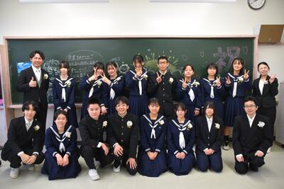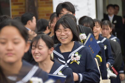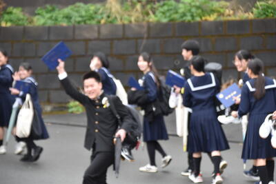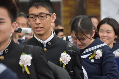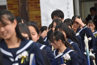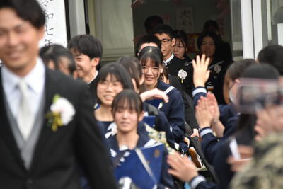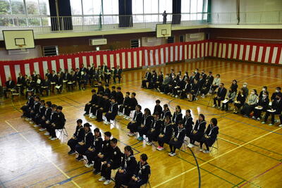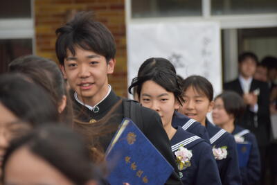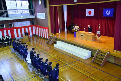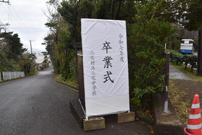 本日、第19回三宅中学校卒業式を挙行しました。会式の時間に降っていた雨も式終了後の歓送の時間には晴れ上がり、在校生全員で昇降口前に並び3年生を見送りました。式中は多くの方に祝福と激励のお言葉をいただき、卒業生14名は三宅中学校を巣立っていきました。卒業生の答辞では、生徒一人一人が保護者へ思いを込めたメッセージを伝え、胸熱くなる卒業式となりました。ご参列いただきました保護者の皆様、お子様のご卒業誠におめでとうございます。卒業生一人一人の未来が、光り輝くものとなりますよう、心からお祈り申し上げます。