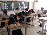 本日の朝学習の時間には、生徒が事前に作成した期末考査の予想問題に挑戦しました。各教科ごとに担当を分担し、自分たちで「先生が出しそうな問題」を考えて出題しました。