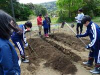 三宅高校農業科の畑の一部を借りて、農業体験をしました。平の状態の畑から、くわやレーキという道具を使い、20mの畝を2列作りました。