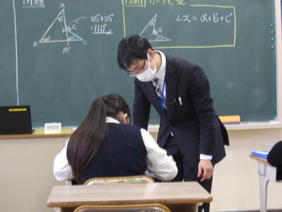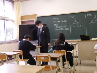 今日の内容は三角形の外角の利用で、目標は「三角形の外角の性質を利用して問題に取り組む」でした。前回までの復習を行った後、「今日の内容は受験にも使うことなので、ノートに記入してください。」と先生から話があり、生徒は板書された例題をノートに書きました。例題の答えを導き出すために自分で考える時間がありました。考えを深めている生徒に対して先生は「素晴らしい」「よい補助線を引いているよ」「惜しい」など声かけしていました。その後、全体で答えを導き出すための考え方を共有した後、テスト対策のプリントに取り組みました。