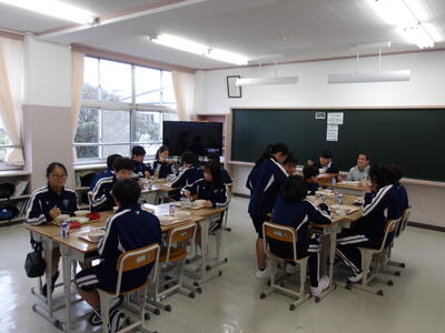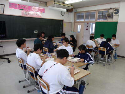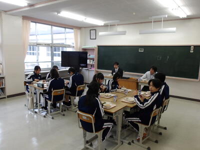 今日の給食時間の様子です。今日のメニューは、麦ご飯、鰆の照り焼き、明日葉のごま和え、なめこ汁、牛乳です。各学年班になって会話を楽しみながら食事をしていました。1年生は、先生のみの班も。これからいろいろな班の形を試していくそうです。どんな班の形になるか楽しみですね。